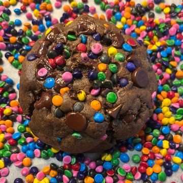 An out-of-this-world take on the classic cosmic brownie. This 6.5-ounce mega cookie is rich, fudgy, and packed with gooey chocolate goodness, topped with a galaxy of colorful candy-coated chips. It’s everything you love about a brownie… reimagined as a cookie and supercharged with cosmic flair.